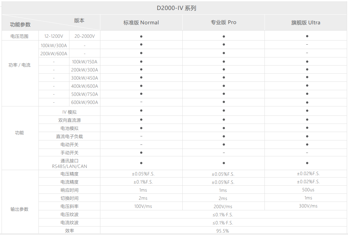 科威尔d2000-iv 系列支持设定仿真单晶硅、多晶硅、薄膜电池等多种电池类型,开放设定温度、光照因子、运行时间等参数,可实现客户自定义编程功能。 内置 en50530、sandia、sas、nb/t32004、cgc/gf004、cgc/gf035 等法规模型测试,满足光伏并网逆变器测试需求。